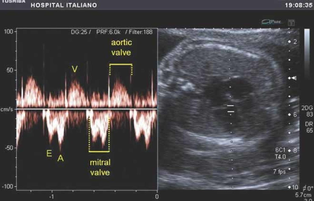 - Obtain tri-phasic waveform by placing Doppler gate inside LV, adjacent to Mitral valve and Aortic valve simultaneously. This location will demonstrate LV filling and emptying.